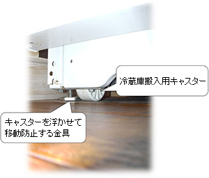 キッチンには食器棚や冷蔵庫など大型の家具・家電が詰まっています。すべて転倒防止措置を行ってください。ほとんどの冷蔵庫は搬入用にキャスターが付いています。通常は、搬入が終わった段階で、キャスターをロックしたり、浮かせて固定する金具などで冷蔵庫の底部を固定することになっています。これを怠ると地震時に冷蔵庫が滑り出してしまいます。転倒防止と合わせて、底部の固定を確認しましょう。