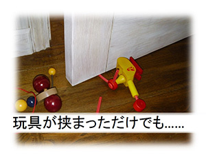 たいていの居室は、ドアが室内側に開く方式です。ドアの下に小さな玩具が挟まっただけでも、子供の力では、ドアを開けることができないかもしれません。